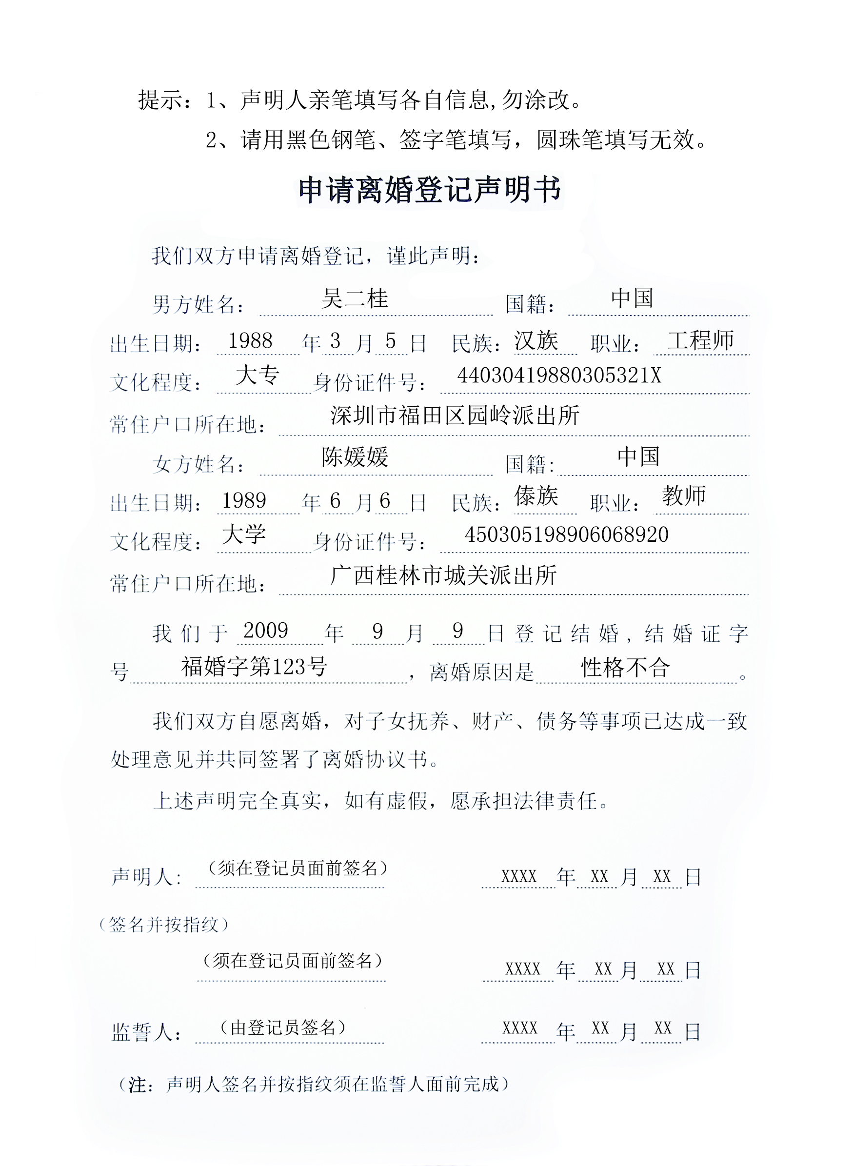 3、《申请离婚登记声明书》 | 《申请离婚登记声明书》中“声明人”一栏的签名必须由声明人在监誓人面前完成并按指纹。